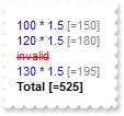 An invalid line is not evaluated, and so no result is being shown. The FormatResult property specifies the HTML format of the result. The FormatTotalResult / FormatSubTotalResult property formats the Total / Sub-Total lines. The FormatCountResult / FormatSubCountResult property specifies the HTML format of lines that contains Count or SubCount aggregate function.