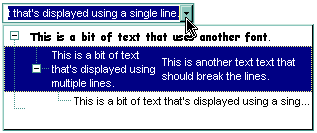 thisform.ComboBox1.BeginUpdate() with thisform.ComboBox1.Items .DefaultItem = .FocusItem .ItemFont(0) = thisform.ComboBox1.Font with .ItemFont(0) .Name = "Comic Sans MS" .Bold = .t. endwith endwith thisform.ComboBox1.EndUpdate()