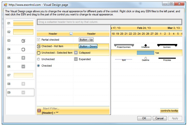 The following picture shows the control's VisualDesign form after applying some EBN objects: