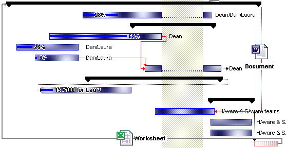 items.AddBar( h, COleVariant( "Task"), COleVariant( (double)chart.GetNextDate( d, 4096, COleVariant((long)2) ) ), COleVariant( (double)chart.GetNextDate( d, 4096, COleVariant((long)4) ) ), vtMissing , vtMissing );The following C++ sample adds an item with three bars ( two "Task" bars, and one "Split" bar ) that looks like above: