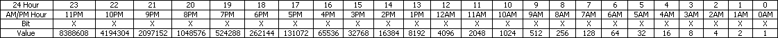 | 24 Hour | 23 | 22 | 21 | 20 | 19 | 18 | 17 | 16 | 15 | 14 | 13 | 12 | 11 | 10 | 9 | 8 | 7 | 6 | 5 | 4 | 3 | 2 | 1 | 0 |