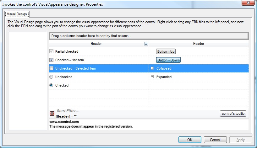 The following picture shows the control's VisualDesign form after applying some EBN objects: