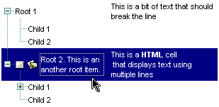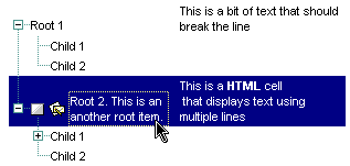The following screen shot shows the "Root 1" and "Root 2" cells that are aligned to the bottom of the item, and the +/- signs are always displayed as CellVAlignment property indicates.