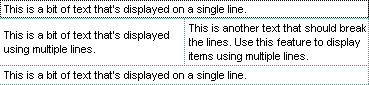 By default, the CellSingleLine property is exCaptionSingleLine / True, which indicates that the cell's caption is displayed on a single line. Use the Def(exCellSingleLine) property to specify that all cells in the column display their content using multiple lines. The control can displays the cell's caption using more lines, if the CellSingleLine property is exCaptionWordWrap or exCaptionBreakWrap. The CellSingleLine property wraps the cell's caption so it fits in the cell's client area. If the text doesn't fit the cell's client area, the height of the item is increased or decreased. When the CellSingleLine is exCaptionWordWrap / exCaptionBreakWrap / False, the height of the item is computed based on each cell caption. If the CellSingleLine property is exCaptionWordWrap / exCaptionBreakWrap / False, changing the ItemHeight property has no effect. Use the ItemMaxHeight property to specify the maximum height of the item when its height is variable. Use the CellVAlignment property to align vertically a cell.