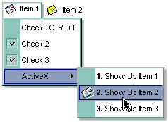By default, the OpenMode property is Vertical . If the OpenMode property is Vertical, the items in the menu bar are arranged from top to bottom, line by line, one item per line. If the OpenMode property is Horizontal the items of the menu bar are arranged from left to right. The menu bar is displayed always in the form. Use the Appearance property to specify the control's appearance. Use the Font property to specify the control's font. Use the BackColor property to specify the control's background color. Use the ForeColor property to specify the control's foreground color. The OpenOnClick property specifies whether the sub menu is opened when the user clicks the item in the menu bar.
