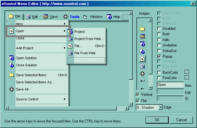 Use the Add method to add items are runtime. Use the ToString method to quick load items from a formatted string. The Separator property specifies whether an item is of Separator type . The Popup property specifies whether the item contains sub items. Use SubMenu property to access the sub items of a popup item. The Refresh method must be called to reflect the changes on the control's content. Use the SubControl property to specify the control's identifier, when ItemType is SubControl. The ItemHeight property specifies the height for the items in the menu