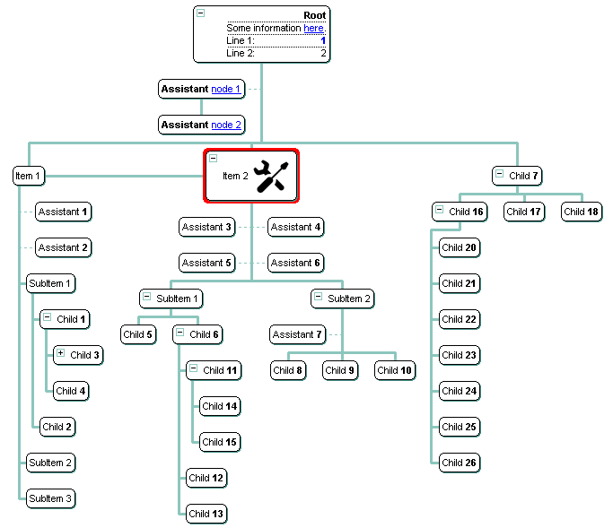 For instance, in the above screen shot, the Item 1 has its child nodes as a tree, so the ArrangeSiblingNodesAs for this node is exTree. The Child 7, displays horizontally, its child nodes from left to right, so its ArrangeSiblingNodesAs property is exHorizontally, and the Child 16 arranges its child nodes vertically from top to bottom, so its ArrangeSiblingNodesAs property is exDefault.