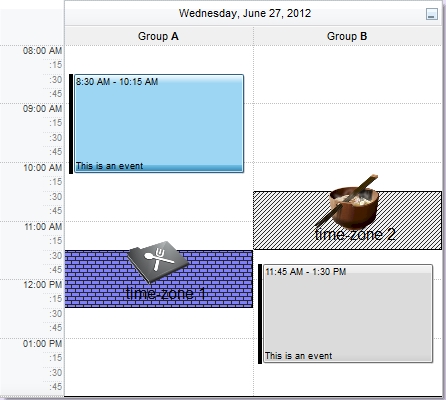 By default, the GroupID property is -1, which means that the time-zone is not assigned to any group. Use a positive value to assign the time-zone to a specific group. Use the Add method of the Groups collection to add new groups to the control. The DisplayGroupingButton property indicates whether the header of the date displays the grouping button. The list of available groups is displayed on a drop down panel, once the user clicks the grouping/filtering button. The GroupID property specifies the identifier of the group where the event belongs. If the control displays groups the GroupID property of the newly created event is automatically updated with the group where the event has been created. The AllowMoveEventToOtherGroup property specifies whether the user can move an event from a group to another at runtime.