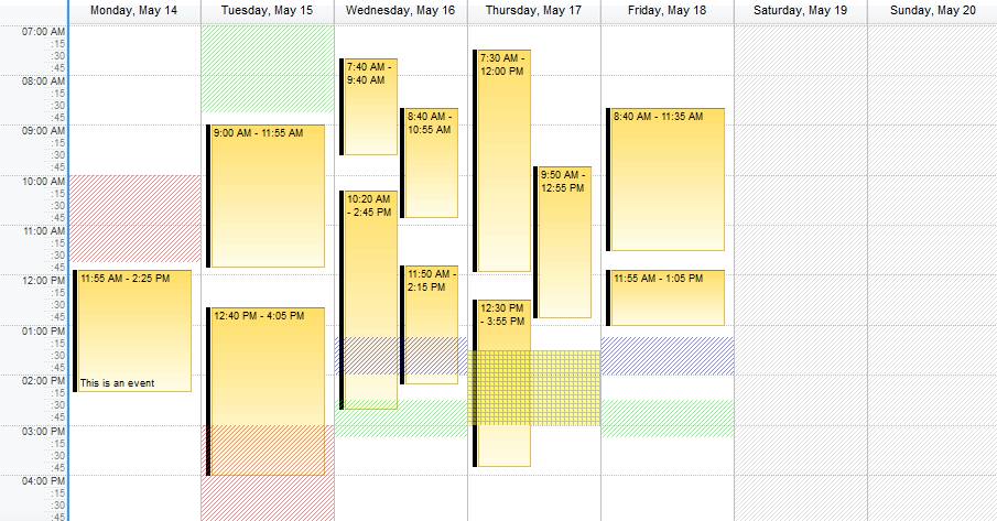 The NonworkingTimes object holds a collection of NonworkingTime objects. The NonworkingTime object indicates a time interval to be shown as non-working. Each NonworkingTime object can associate a NonworkingPattern object that specifies the colors and the pattern to show the non-working zone. The NonworkingPatterns collection is accessible through the NonworkingPatterns property of the control. The NonworkingDays property of the calendar defines the days to be non-working in the calendar.