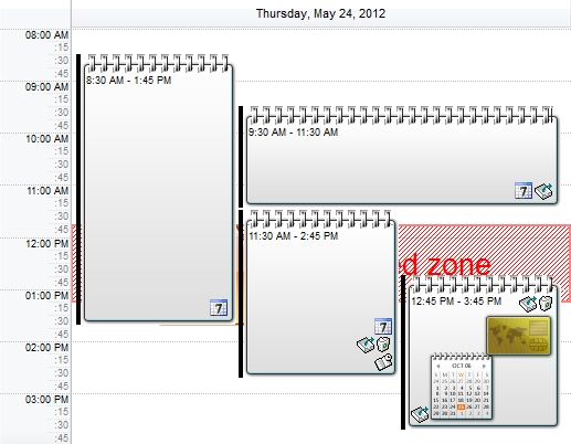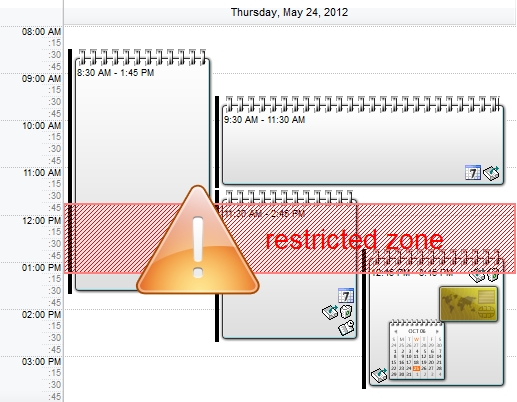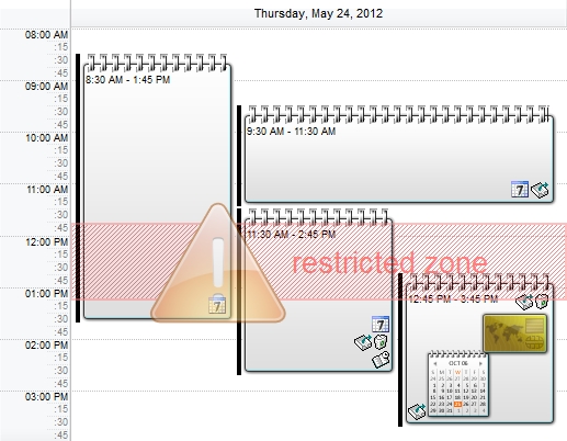 The MarkZones property gets the MarkZones collection. The MarkZones collection holds a set of MarkZone objects ( also called time-zone ). A MarkZone object holds information about a time-zone. A time-zone is identified by a Start/End date time, what can be highlighted in the schedule view. Use the Add method of the MarkZones collection to add a new time-zone to the control. The MarkZoneFromPoint property indicates the time-zone from the cursor.