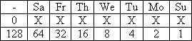 The NonworkingDays property retrieves or sets a value that indicates the non-working days, for each week day a bit. The NonworkingDaysForeColor property retrieves or sets a value that indicates the foreground color for non-working days. By default, the NonworkingDays property is 65. The last significant byte in the NonworkingDays expression has the following meaning: